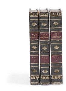 dorée en encadrement sur les plats, dos à faux nerfs orné de motifs dorés et à froid, tranches marbrées (reliure anglaise de l’époque). Édition originale de l’un des derniers romans historiques de Walter Scott (1771-1832), dont l’action se déroule durant les guerres de Bourgogne de 1474 à 1477. Bel exemplaire en reliure de l’époque, provenant de la collection du baron Belper. Quelques frottements aux coiffes, petit accroc à la coiffe supérieure du premier volume, coins légèrement émoussés. Rousseurs. Provenance : Baron Belper, avec son ex-libris.