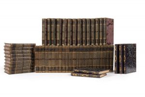 Ensemble 51 volumes in-8 (collations sur demande), 89 pl., reliures de l'époque, les Voyages en demi-veau vert, dos ornés de motifs dorés et grands fleurons à froid, tranches marbrées, les