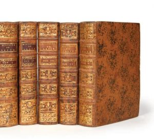 Paris, Des Ventes de la Doué, 1770-75. Cinq volumes in-4 de (2) ff., XVI, 958 pp., une carte; (2) ff., 803, (1) pp.; (1) f., 983 pp.; (1) f., 862 pp.; (2) ff., 904 pp., une carte, reliure de l'époque en veau marbré, dos ornés, tranches rouges.