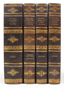 Quatre volumes grand in-8 de: 1) Europe: (2) ff, 361 pp., (1) f., 41 pl.; Asie: (2) ff., 592 pp., 79 pl.; Afrique-Amérique: (2) ff., 365 pp., (1) f., 38 pl. (sur 40); Océanie: (2) ff., 368 pp., 33 pl., reliure de l'époque en demi-basane maroquinée aubergine, dos à nerfs élégamment ornés, tranches mouchetées.