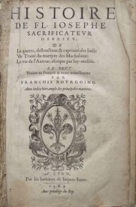 9.JOSÈPHE (Flavius). BOURGOING (François). Histoire de Fl. Josephe Sacrificateur Hebrieu, De la guerre, destruction & captivité des Juifs : Un Traité du martyre des Machabées : La vie de l’Auteur, escripte par luy-mesme. Le Tout Traduit en François & reveu nouvellement par François Bourgoing. Avec indice bien ample des principales matieres. Lyon, Par les heritiers de Iaques Ionte (Jacques Junte ou Giunta), sur les Presses de Pierre Roussin, 1569. In-folio, dérelié, dos à 4 nerfs, conservé dans une reliure vélin en vue d’un réemboîtage. (22)-1040-(87) pp. Pas de pp. 691 à 694 (titre de la Guerre des Juifs). Lettrines et vignettes sur bois gravées dans le texte. Page de titre froissée, déchirure au centre d’un feuillet sans manque, tache brune sur 3 ff., dernier f. renforcé en marge internes. Belle marque de l’imprimeur en page de titre. Réimpression de l’édition de 1562 imprimée par Jean de Tournes aux dépens des héritiers de Jacques Junte, en vertu du privilège qui leur avait été cédé par Jean Temporal, libraire de Lyon. (La traduction de Fr. Bourgoing ayant été préalablement imprimée par Jean Temporal en 1558). Brunet III, 571; Baudrier, Bibliogr. lyonnaise, VI, 330.