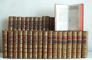 16.SABBATHIER (François). Dictionnaire pour l’Intelligence des Auteurs Classiques, Grecs et Latins, tants sacrés que profanes, contenant la géographie, l’histoire, la fable et les antiquités… Châlons-sur-Marne, Seneuze, Paris, Delalain, puis Volland, puis Crapart (t. 37), 1766-1790-1815. 37 volumes in-8, reliure veau marbré pour 30 vol. et basane marbrée pour les 7 derniers vol. (avec pièces de titre refaites), dos à nerfs orné. Qq. épidermures, qq. défauts sur une dizaine de coiffes, bon état d’usage. Qq. rousseurs et taches brunes marginales. Manque l’atlas. Édition complète en 37 volumes - sans l’atlas - de cet ouvrage « rempli de recherches savantes », le plus connu de François Sabbathier (1735-1807) qui s’est arrêté à la lettre S. Le tome 37 (S-Z), posthume, a été achevé par Antoine Serieys. Brunet V, 5.