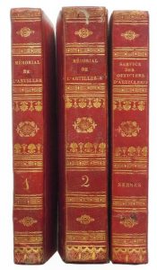 38.[ARTILLERIE]. Mémorial de l’Artillerie, ou Recueil de Mémoires, expériences, observations et procédés relatifs au service de l’artillerie; rédigé par les soins du comité, avec l’approbation du Ministre de la Guerre. Paris, Imp. de Fain, 1826-1828. 2 volumes in-8, reliure demi-basane rouge, dos lisse orné, tranches jaunes. Qq. épidermures au dos et sur les plats. T. 1 : (4)-324 pp., tableaux dont 2 dépliants et 5 planches dépliantes. T. 2 : (4)-437-(2) pp., 2 tableaux et 12 planches dépliantes in fine. Qq. rousseurs, trace de mouillure en marge des 25 premiers ff. du t. 1, tache d’encre en marge des derniers ff. du t. 2. On joint : SERRES (Capitaine Jn-Jh). Cours sur le Service des Officiers d’Artillerie dans les Fonderies. Toulouse, Corne, 1834. In-8, même reliure. Accroc au dos, coiffe supérieure frottée. 437-(2) pp. Seconde édition tirée à 310 exemplaires réservés aux souscripteurs.