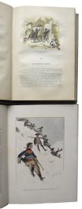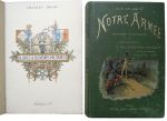 39.MILITARIA. Réunion de deux ouvrages : •BIGOT (Charles). Gloires & Souvenirs Militaires d’après les Mémoires du Canonnier Bricard, du Maréchal Bugeaud, du Capitaine Coignet, d’Amédée Delorme, du Timonier Ducor, du Général Ducrot … Paris, Hachette, 1894. In-4, reliure demi-chagrin havane à coins, dos à 5 nerfs. Qq. légers frottements. Couvertures conservées. viii-272 pp. et 24 planches en couleurs hors texte d’après les aquarelles de Alfred Paris, Le Blant, Delort et Maurice Orange. Bel état. •LONLAY (Dick de). Notre Armée. Histoire populaire et anecdotique de l’infanterie française depuis les Gaulois jusqu’à nos jours. Nombreux dessins en couleurs par l’Auteur. Paris, Garnier, 1890. In-8, cartonnage éditeur percaline verte, décor polychrome sur le premier plat, tranches dorées, plats biseautés. Qq petites taches de décoloration, coins émoussés. (2)-1138 pp. et planches en couleurs hors texte. Qq. ressauts de cahier, manque gardes liminaires. Illustrations en couleurs en tête des chapitres.