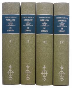 46.[LIMOGES]. NADAUD (Abbé Joseph). Nobiliaire du Diocèse et de la Généralité de Limoges publié par l’abbé Roy de Pierrefitte continué par l’abbé A. Lecler. Augmenté d’une Table rédigée par les Archives départementales de la Corrèze. Paris, Éditions du Palais Royal, 1974. 4 volumes in-8, reliure éditeur skivertex vert olive, pièce de titre vert foncé, écusson doré sur les premiers plats. Très bon état. Réimpression anastatique de la seconde édition (Limoges, Ducourtieux, 1882). Saffroy II, 26883.