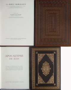 50.[BIBLE]. HAUSSHERR (Reiner). La Bible Moralisée de la Bibliothèque Nationale d’Autriche. Codex Vindobonensis 2554 reproduite en fac-similé intégral. Traduction française par É. Wintzenrieth. Paris, Club du Livre - Ph. Lebaud, 1973. 2 volumes in-folio, reliure éditeur skivertex chamois, dont l’une (Codex) ornée de grandes plaques à froid sur les plats, emboîtage couleur chamois, intérieur en suédine. Beau fac-similé de ce Codex composé de pages historiées richement enluminées (131 pl.). Très bon état. Édition bilingue tirée à 3000 exemplaires numérotés dont celui-ci. On joint : GROSJEAN (Jean). Apocalypse de Jean. Fac-similé du manuscrit douce 180 conservé à la Bodleian Library d’Oxford, accompagné de la traduction en français et d’une étude de Jean Grosjean… Paris, Club du Livre - Ph. Lebaud, 1981. 2 volumes in-folio, reliure éditeur cuir brun foncé imitation maroquin, dont l’un richement orné de grandes plaques dorées sur les plats, chacun contenu dans un étui bordé (deux petites taches sur l’un). 124-(6) pp. pour le texte et (25)-97 pp. illustrées de miniatures pour le fac-similé. Édition bilingue tirée à 3000 exemplaires numérotés dont celui-ci.