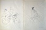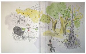 52.[Vertès]. BAUËR (Gérard). Instants et Visages de Paris. Paris, Imprimerie Nationale, André Sauret, 1951. In-folio, en feuillets, emboîtage toile grège (qq. taches, déchirure en tête et pied d’un mors). Couverture en couleurs. 155-(5) pp. Illustrations en noir dans le texte, à pleine page et à double page. Qq. rousseurs. Édition tirée à 225 ex. sur Grand Vélin d’Arches filigrané Vertès, tous signés par l’artiste et l’auteur, dont celui-ci, un des 35 ex. comprenant deux dessins originaux (un seul dessin annoncé) et une suite complète en noir des 62 lithographies originales.