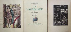 58.COLETTE. La Vagabonde. Illustré par Dignimont. Paris, Mornay, 1926. 2 parties en un volume in-8, reliure (signée Marius Magnin) demi-maroquin lavallière à coins, tête dorée. Couvertures et dos conservés. (4)-333-(2) pp. Deux frontispices, illustrations en couleurs dans le texte. Édition tirée à 65 ex. hors commerce et 1000 ex. numérotés dont celui-ci, un des 892 ex. sur papier de Rives. •WILDE (Oscar). Le Portrait de Dorian Gray. Bois gravés de Fernand Siméon. Paris, Mornay, 1920. In-8, reliure (signée Marius Magnin) demi-maroquin vert-gris à coins, tête dorée. Couvertures et dos conservés. Frontispice, (4)-370-(3) pp. Illustrations dans le texte. Édition tirée à 40 ex. hors commerce et 1000 ex. numérotés dont celui-ci, un des 928 ex. sur papier de Rives.