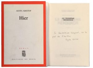 71.KRISTOF (Agota). Réunion de deux ouvrages dédicacés à Madeleine Chapsal : •Le Troisième Mensonge Paris, Seuil, 1991. In-8, broché. Dernier volet de la trilogie du Grand Cahier. Édition originale (pas de grand papier annoncé) avec envoi. •Hier. Paris, Seuil, 1995. In-8, broché. 146-(7) pp. Édition originale (pas de grand papier annoncé) avec envoi signé : à Madeleine Chapsal Cordialement sur le faux-titre.