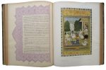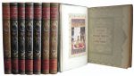 83.[MARDRUS]. Le Livre des Mille Nuits et une Nuit. Traduction littérale et complète du Dr J.-C. Mardrus. Paris, Eugène Fasquelle, s. d. (v. 1910). 8 volumes in-folio, reliure éditeur demi-basane bleue, dos mosaïqué d’un décor de fleurs et de croissants de lune, tête dorée. Dos passés sur 3 vol., déchirure en pied du t. 3, qq. épidermures, coiffes frottées. Belle édition avec le texte composé dans des encadrements de couleurs différentes et 156 planches en couleurs hors texte (fac-similé des miniatures, encadrements et enluminures qui ornent les manuscrits originaux persans et hindous).