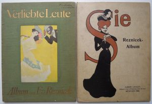 90.REZNICEK (Ferdinand von). Réunion de deux albums du peintre et caricaturiste Ferdinand von Reznicek (1868-1909) : •Sie. Reznicek-Album. München, Albert Langen, 1900. In-folio, cartonnage éditeur percaline crème, plat décoré d’une femme en robe noir enlacée par la lettre S du mot Sie (Elles en allemand). Rousseurs, ex-libris cachet (discret) sur le premier plat. Titre, xxxii pp. 31 planches en couleurs comportant de grandes illustrations légendées ou des suites de vignettes. •Verliebte Leute. München, Albert Langen, s. d. (1909). In-folio, cartonnage éditeur toile verte, plat décoré. Dos en partie déboîté. Ex-libris manuscrit en tête du premier plat. Titre, xxxii pp. 31 planches en couleurs comportant de grandes illustrations légendées. Très bon état intérieur.