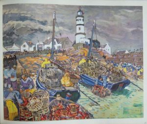 94.VERCEL (Roger). Pêcheurs des Quatre Mers. Illustrations de Albert Brenet, Marin-Marie, Mathurin Méheut. Nantes, Beuchet et Vanden Brugge, 1957. In-4 oblong, broché. Couverture crème rempliée et illustrée (légères traces de mouillure en marge supérieure et sur les tranches). Ex-dono sur une page de garde. 305-(3) pp. Bandeaux et culs-de-lampe en noir par Mathurin Méheut. Bel état intérieur. Édition originale composée de plusieurs chapitres illustrés en couleurs dans le texte et à pleine page par les trois artistes : Les Poissons chez eux (Méheut), Les Ports de la morue (Marin-Marie), Boulogne-sur-mer (Méheut), Les Ports de la pêche fraîche (Brenet), Les Ports de la sardine (Méheut), Les Ports du thon (Brenet), Les Ports des crustacés (Méheut), Les Ports de la Méditerranée (Méheut), La Conserve du poisson (Brenet), La Construction des bateaux de pêche (Brenet et Marin-Marie), La Pêche scientifique (Brenet), La Pêche et la littérature (Méheut).