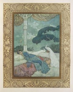 103.DULAC (Edmond). KHÁYYÁM (Omar). RubÁiyÁt. Paris, Piazza, 1910. In-4, broché. Dos en partie débroché. Non paginé. Illustré de 20 magnifiques compositions contrecollées dans des encadrements rehaussées d’or. Ornements et frise de fleurs encadrant le texte traduit par Edmond Dulac d’après la version poétique de Edward Fitzgerald. Ouvrage tiré à 700 ex. numérotés dont celui-ci, en tirage de tête, un des 300 exemplaires sur papier du Japon, signé par Edmond Dulac.