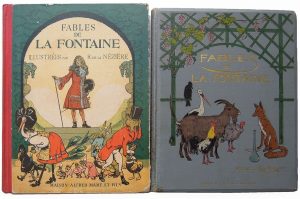 116.LA FONTAINE (Jean de). Réunion de deux albums illustrés : •Cent Fables Choisies. Illustrations de Henry Morin. Paris, Henri Laurens, s. d. In-4, cartonnage éditeur percaline grise, beau décor polychrome sur le plat supérieur, plats biseautés, tranches dorées. Mors un peu sali, coins un peu frottés. 199-(1) pp. Déchirure de 5 cm en marge d’un f., intérieur très propre. Illustrations en noir dans le texte et en couleurs dans le texte. •Fables illustrées par Raoul de La Nézière. Tours, Alfred Mame, s. d. In-4, cartonnage éditeur, dos toile rouge, plats illustrés. Coupes et coins frottés. 158-(1) pp. Deux petites déchirures, taches et traces de doigt en marge. Illustrations en noir dans le texte et en couleurs à pleine page.
