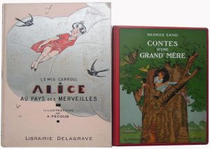119.PÉCOUD (André, 1880-1951). Réunion de deux ouvrages : •CARROLL (Lewis). Alice au Pays des Merveilles et À travers le Miroir. Illustrations de A. Pécoud. Paris, Delagrave, 1935. In-4, cartonnage éditeur percaline rose, dos et plat supérieur illustré (légers frottements). Frontispice, 182-(1) pp. et 15 planches hors texte. Bon exemplaire. •SAND (George). Contes d’une Grand’Mère. Illustrations de A. Pécoud. Paris, Henri Laurens, 1939. Petit in-4, cartonnage éditeur percaline rouge, beau décor polychrome sur le plat supérieur, plats biseautés. 126-(1) pp. et 8 planches hors texte en couleurs. Illustré de dessins en noir dans le texte. Bon exemplaire.