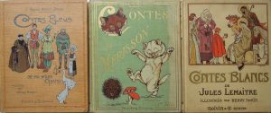 123.ROBERT-DUMAS et alii. Réunion de trois albums en cartonnage éditeur : •ROBERT-DUMAS (Charles). Contes Bleus de ma Mère-Grand. Dessins de Henry Morin. Paris, Boivin et Cie, 1913. In-4, cartonnage éditeur percaline ocre, décor polychrome sur le plat, tête dorée. 164-(2) pp. Illustré de dessins en noir dans le texte et 9 grands dessins en couleurs à pleine page. •LEMAITRE (Jules). Contes Blancs. Dessins de Henry Morin. Paris, Boivin et Cie, 1934. In-4, cartonnage éditeur percaline crème (qq. légères salissures), décor polychrome sur le plat. 158-(1) pp. Illustré de dessins en noir dans le texte et 8 grands dessins en couleurs contrecollés à pleine page. •ROCHE-MAZON (Jeanne). Contes du Hérisson. Illustrations de O’Klein. Paris, Boivin et Cie, 1934. In-4, cartonnage éditeur percaline vert pâle, décor polychrome sur le plat. Dos et bordures insolés. 157-(3) pp. Illustré de dessins en noir dans le texte et 8 grands dessins en couleurs contrecollés à pleine page.