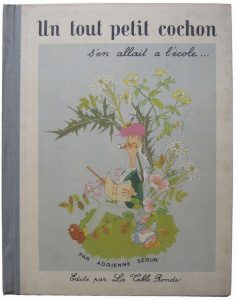 126.SÉGUR (Adrienne). PIC (Professeur). Un tout petit Cochon s’en allait à l’école… Illustré par Adrienne Ségur. Paris, La Table Ronde, 1946. In-4, cartonnage éditeur, dos toile grise, premier plat illustré. Non paginé. Illustrations en couleurs dans le texte et à pleine page. Edition originale. Très bon état.