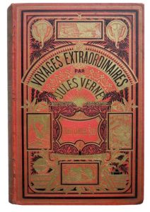 129.VERNE (Jules). Nord contre Sud. 85 dessins par Benett et une carte. Paris, Hetzel, s. d. (1887). Grand in-8, cartonnage éditeur percaline rouge aux deux éléphants, tranches dorées. Dos passé, petits accrocs sur les mors. (4)-416-(8) pp. Rousseurs. Catalogue DS. Première édition grand in-8 illustrée. Jauzac 245.