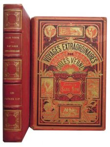 131.VERNE (Jules). Famille sans Nom. 82 dessins de G. Tiret-Bognet et une carte en couleurs. Paris, Hetzel, s. d. (1889). Grand in-8, cartonnage éditeur percaline rouge aux deux éléphants, tranches dorées. Dos passé et premier plat recollé, petite déchirure dans l’angle d’un mors, coins usés. (4)-422-(2 bl.)-(8) pp. et une carte hors texte à double page. Rousseurs. Catalogue EX avec les nouveautés pour 1889-90. Première édition grand in-8 illustrée. Exemplaire avec une étiquette corrigée, apposée sur le cartouche du premier plat. Jauzac 255. On joint : VERNE (Jules). Les Frères Kip. Illustrations par Georges Roux. 12 grandes chromotypographies. Nombreuses vues photographiques. Deux cartes. Paris, Hetzel, s. d. (v. 1905). Grand in-8, reliure demi-chagrin rouge aux harpons. Trace de mouillure en bordure latérale des plats et des gardes, gouttière en bon état. (4)-459-(1) pp. et 12 planches hors texte. Intérieur propre. Jauzac 294.