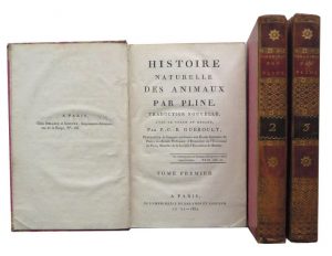 150.PLINE. Histoire Naturelle des Animaux. Traduction nouvelle, avec le texte en regard, par P.-C.-B. Gueroult. Paris, Imp. Delance et Lesueur, An XI - 1802. 3 volumes in-8, reliure demi-veau brun à petits coins de vélin, dos lisse orné. Qq. frottements, usures sur les coupes, petit accroc sur le plat supérieur du t. 1. T. 1 : (4)-xiv-(1)-487 pp. T. 2 : (4)-416 pp. T. 3 : (4)-402-(1) pp. Rares rousseurs. Édition bilingue avec une importante table des matières et un index latin-français en fin du tome 3.
