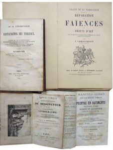 160.[ARTS & MÉTIERS]. Réunion d’ouvrages : •BRÉGEAUT (R. L.). Manuel Complet Théorique et Pratique du Dessinateur et de l’Imprimeur Lithographe. Seconde édition, revue, corrigée, augmentée et ornée de 12 lithographies. Paris, Roret, 1827. In-12, reliure basane brune, dos lisse orné. Épidermures, coins usés. xxxvi-176-(36) pp. et 12 lithographies hors texte (parfois réunies sur la même pl. dépliante). Rousseurs. •DÉON (Horsin). De la Conservation et de la Restauration des Tableaux. Paris, Bossange, 1851. In-12, reliure demi-basane brune, dos à 4 nerfs orné. Épidermures, coiffes arasées, fentes au départ des mors. viii-234 pp. Trace de mouillure sur toute la moitié inférieure de l’ouvrage. •LAMBOURSAIN (J.). Traité de la Fabrication et de la Réparation des Faïences et Objets d’Art. Avec un appendice contenant toutes les Marques des faïences et porcelaines françaises. Paris, Le Bailly, Bornemann, s. d. In-8, broché. xi-115 pp. •RIFFAULT, TOUSSAINT et VERGNAUD. Nouveau Manuel Complet du Peintre en Batiments, Vernisseur, Vitrier, Doreur et argenteur sur bois, sur porcelaine et sur verre … Nouvelle édition, entièrement refondue et augmentée de nouveaux procédés usuels par F. Malepeyre. Paris, Roret, 1870. In-12, reliure demi-basane bleue, dos lisse souligné de filets dorés. Épidermures, coins usés. (4)-vii-344 pp. Rousseurs. Manque les 2 pl. et 2 derniers ff. de table.