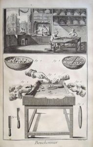 163.ENCYCLOPÉDIE. Recueil de Planches sur les Sciences, les Arts Libéraux et les Arts Mécaniques, avec leur explication. Seconde livraison, en deux parties. Première partie, 233 planches. Paris, Briasson, David, Le Breton, Durand, 1763. In-folio, reliure de l’époque veau brun, très abîmée. Volume complet de ses planches, réparties comme suit : Balancier (5 pl.), Métier à faire des bas (3 pl. simples et 8 doubles), Batteur d’or (2 pl.), Blanc de baleine (1 pl.), Blanchissage des toiles (2 pl.), Blason ou Art héraldique (26 pl. simples et une triple), Boisselier (2 pl.), Bonnetier de la foule (2 pl.), Boucher (2 pl.), Bouchonnier (1 pl.), Boulanger (1 pl.), Bourrelier (7 pl.), Boursier (3 pl.), Boutonnier (6 pl.), Boyaudier (1 pl.), Brasserie (5 pl.), Brodeur (2 pl.), Fonderie en caractères d’imprimerie précédé de la gravure des poinçons (8 pl.), Caractères et alphabets (25 pl.), Écritures (16 pl.), Cardier (1 pl.), Cartier (6 pl.), Cartonnier et gaufreur en carton (2 pl.), Ceinturier (2 pl.), Chainetier (3 pl.), Chamoiseur et Mégissier (5 pl.), Chandelier (2 pl.), Chapelier (3 pl.), Charpenterie (70 pl. dont 36 simples et 17 doubles).