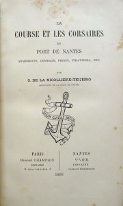 198.LA NICOLLIÈRE-TEIJERO (Joseph-Étienne Praud de, dit Stéphane de La Nicollière-Teijero). La Course et les Corsaires du Port de Nantes. Armements, combats, prises, pirateries, etc. Paris, Champion, Nantes, Ve Vier, 1896. In-8, reliure demi-chagrin brun, dos à 5 nerfs orné. Qq. frottements, et usures sur les coupes, coin inférieur plié au second plat. (8)-viii-448 pp. Rousseurs, notamment sur les tranches. Édition originale de cet important ouvrage sur l’histoire des corsaires nantais du XVe au XIXe siècle par La Nicollière-Teijero (1824-1900), archiviste et historiographe de la ville de Nantes, président de la Société archéologique et historique de Nantes et de Loire-Atlantique de 1893 à 1895. Polak 5285. L’exemplaire est complété d’une vingtaine de pages manuscrites de l’auteur comportant des corrections se rapportant aux pages du livre et des notes complémentaires concernant notamment la famille Ripaud de Montaudevert et le capitaine de frégate René Guiné. Polak 5285.