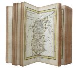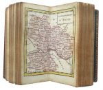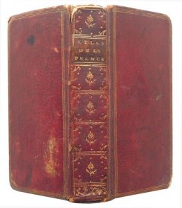 204.DESNOS (Louis-Charles). Atlas de la France, Divisée en ses 40 Gouvernemens Généraux et Militaires, en autant de Cartes particulières avec les principales routes qui traversent les Provinces du Royaume. Assujetties aux nouvelles Observations de MM. de l’Académie Rle des Sciences. Paris, Desnos, 1775. In-16, reliure maroquin bordeaux, dos lisse orné, triple filet doré en encadrement sur les plats, tranches dorées, roulette intérieure. Coiffe supérieure arasée, qq. frottements, coins usés. 2 ff. et 47 cartes coloriées à double page dont une carte de France et 46 cartes numérotées 1 à 47 (pas de carte n° 16), montées sur onglet. Nombreuses annotations à l’encre (nouvelle numérotation des cartes et table des cartes sur les gardes par le propriétaire).