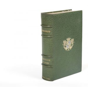 dos à nerfs, large carde de maroquin vert à l’intérieur, orné de 3 filets dorés, doublures et gardes de soie moirée grise, doubles gardes de papier doré, tranches dorées sur témoins, couverture et dos conservés, chemise à dos et bandes à rabats de maroquin vert, étui (Robert Blaizot). Édition tirée à un peu plus de 200 exemplaires, illustrée de 17 burins originaux de Camille-P. Josso. PRÉCIEUX EXEMPLAIRE NOMINATIF, SPÉCIALEMENT IMPRIMÉ SUR PAPIER JAPON NACRÉ POUR L’ÉDITEUR PIERRE DE TARTAS, enrichi de 6 suites des illustrations, à savoir une suite en premier état, une suite en deuxième état, les deux sur papier vélin, ainsi que 4 suites définitives sur vélin, vergé, Auvergne et sur soie. L’exemplaire comporte également cet envoi de l’artiste : “Pour mon excellent ami Pierre Lanauve de Tartas ce travail qui m’a enchanté. Très cordialement. C.-P. JOSSO”. Très belle reliure originale de Robert Blaizot, portant des armes comtales sur le premier plat. Légère insolation à la chemise.