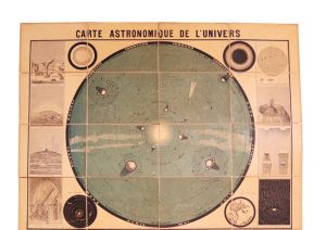 Carte astronomique de l'univers. S.l., L. Révon, s.d. [vers 1877]. Carte gravée (130 x 90 cm), entoilée. Grande et belle carte astronomique, très décorative, entourée de 25 figures gravées et accompagnée de Principes élémentaires d'astronomie imprimés en colonnes.
