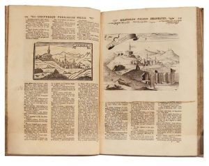 Universus terrarum orbis scriptorum calamo delineatus. Padoue, Giambattista Conzatti, 1713. 2 volumes in-folio, vélin souple, dos lisse, tranches mouchetées de bleu (Reliure de l'époque). Édition originale de ce monumental dictionnaire géographique très abondamment illustré, œuvre de Raffaele Savonarola (1646-1730) publiée sous le pseudonyme d'Alfonso Lasor a Varea.