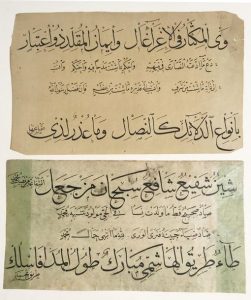 Deux exercices calligraphiques Qita’. Encre sur papier. Turquie, XIXe siècle. Hauteur : 13,3 et 11,8 ; Largeur : 21,8 et 22 cm. En écriture thuluth et naskh, répartie sur quatre lignes, comportant des textes religieux.