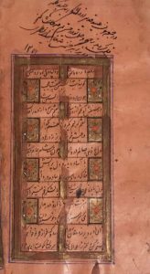 Diwan de Hafiz. Encre, pigments polychromes et or sur papier coloré. Iran, XVIe siècle (reliure postérieure). Hauteur : 15,9 cm ; Largeur 9,4 cm ; Profondeur : 2,5 cm. Manuscrit persan acéphale du Diwan de Hafiz en écriture nasta’liq répartie sur 14 lignes par page, sur papier de couleur, comportant de nombreux cartouches enluminés à décor floral sur fond or sur les lignes de texte, et filets d’encadrements dorés sur chaque page, et notes marginales diverses.