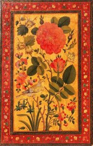 Ce manuscrit comporte une reliure en papier mâché laqué polychrome de même période à décor de Gul-o-bulbul (rose et rossignol) sur fond or, un thème très en vogue à cette période.