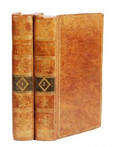Voyage en Syrie et en Égypte, pendant les années 1783, 84 et 85. Paris, Dugour et Durand, an VII [1799]. 2 volumes in-8, basane racinée, roulettes dorées, dos lisse orné, tranches jonquille (Reliure de l'époque). Troisième édition augmentée, illustrée de 3 cartes et un plan, 4 planches de vues du Sphynx, des pyramides de Gizeh, des ruines de Palmyre et de Baalbek, plus un tableau imprimé, tous dépliants.