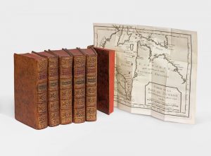 Histoire et description generale de la Nouvelle France, avec le journal historique d'un Voyage fait par ordre du Roi dans l'Amérique Septentrionnale. Paris, Nyon fils, 1744. 6 volumes in-12, veau marbré, dos orné, tranches rouges (Reliure de l'époque). Première édition in-12 de cet « ouvrage précieux pour l'histoire du Canada et de la Louisiane » (Chadenat).
