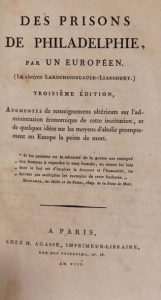 L'ouvrage, premier examen par un Français d'un système pénitentiaire américain, sera encore réédité en 1819, tout cela bien avant Beaumont et Tocqueville. C'est au cours de son long périple aux États-Unis et au Canada, en 1794-1797 que le Duc de Liancourt (1747-1827), toujours à l'affût de toute information sur l'amélioration sociale, eut l'occasion de visiter les prisons de Philadelphie. Son compte-rendu fut traduit en anglais la même année que la sortie de l'originale française.