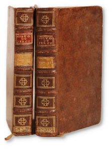Histoire de la découverte et de la conquête du Pérou. Paris, la Compagnie, 1716. 2 volumes in-12, veau moucheté, dos orné, tranches marbrées (Reliure de l'époque). Nouvelle édition de cette traduction, par Broc, seigneur de Citry, illustrée d'un frontispice, d'une carte repliée et de 13 planches gravées sur cuivre, non signées.