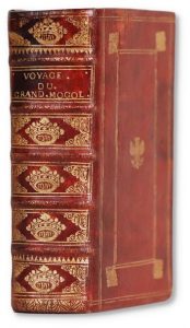 Voyages. Contenant la description des Etats du Grand Mogol, de l'Hindoustan, du Royaume de Kachemire, &c. Amsterdam, Paul Marret, 1699. 2 tomes en un volume in-12, maroquin rouge, décor à la Du Seuil, fer d'aigle à tête de femme doré au centre, dos orné d'un fer au Tétragramme couronné répété, dentelle intérieure, tranches dorées (Reliure de l'époque). Édition originale collective de cette excellente relation sur l'Inde et le Cachemire. « Aucun voyageur, avant l'auteur, n'avait visité le Cachemire » (Boucher de la Richarderie).