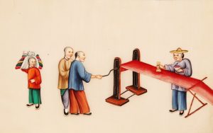 Album d'aquarelles. S.l.n.d. In-4 oblong, toile orangée brodée (Reliure moderne). Précieux recueil de 12 fines aquarelles chinoises exécutées sur papier de riz, représentant toutes les étapes de la culture du ver à soie, du tissage et de la teinture de la soie.