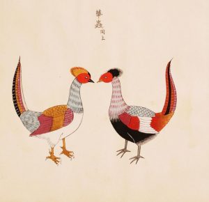 Benfuku zuchō. Kyoto, Unsōdō, Meiji 40 [1907]. 3 volumes in-4 (37 x 24,6 cm) de [32], [25] et [21] ff., cartonnage de papier vert olive, chaque plat supérieur orné d’une pièce de titre imprimée. Édition illustrée de nombreux bois gravés polychromes à pleine page. La plupart des compositions sont délicatement rehaussées à la gouache.