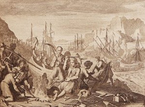 Drie Seldsame Scheeps-Togten. Leyde, Pieter van der Aa, s.d. [1706]. In-folio, bradel demi-vélin blanc (Reliure moderne). Une carte repliée.