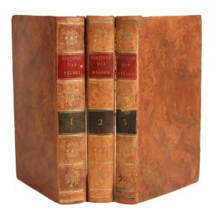 Histoire des pêches, des découvertes et des établissemens des Hollandois dans les mers du Nord. Paris, Veuve Nyon, an IX [1801]. 3 volumes in-8, basane racinée, dos lisse orné, tranches jonquille (Reliure de l'époque). Seconde édition française, la première complète, de cet ouvrage très détaillé sur les pêches du Grand Nord.
