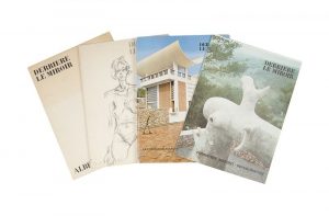 miroir, consacrés notamment à Alberto Giacometti. Comprend : - N° 98, Juin 1957 : texte de Jean Genet “L’Atelier d’Alberto Giacometti”. Illustré de 11 compositions en noir de Giacometti, dont deux sur les couvertures et une lithographiée sur double page. — Quelques salissures à la couverture. - N° 127, Mai 1961 : textes d’Olivier Larronde (”Alberto Giacometti dégaine”), Léna Leclercq (”Jamais d’espaces imaginaires”) et Isaku Yanaihara (”Pages de journal”). Illustré de 14 LITHOGRAPHIES ORIGINALES de l’artiste, dont 2 sur les couvertures et 3 sur double page. — Légers accrocs et quelques petits trous sur le bord de la couverture et des premiers et derniers feuillets, sans gravité. - N° 148, Juillet 1964 : numéro édité à l’occasion de l’inauguration par André Malraux de la Fondation Marguerite et Aimé Maeght. Texte de Henri Maldiney. Ce numéro est en reliure cartonnée ; il est illustré de 55 photographies en noir, de 2 LITHOGRAPHIES ORIGINALES d’Alberto Giacometti et de Miró, et de 4 lithographies en couleurs d’après les maquettes exécutées pour la Fondation par Braque, Chagall, Ubac et Pierre Tal Coat. Il est joint une affiche noir et blanc représentant la Fondation. — Légères usures aux coiffes et aux coins. - N° 155, Décembre 1965 : comprend l’Allocution de Monsieur André Malraux… lors de l’inauguration de la Fondation Maeght le 28 juillet 1964. Illustré de 11 reproductions en noir, de 5 reproductions en couleurs d’œuvres de Braque, Kandinsky, Bonnard, Miró et Chagall (sur double page), et 2 LITHOGRAPHIES ORIGINALES en couleurs d’Ubac et de Miró. — Il est joint deux affiches, l’une pour les “Dix ans d’art vivant 1945-1955” de la Fondation Maegth et l’autre représentant la Fondation.
