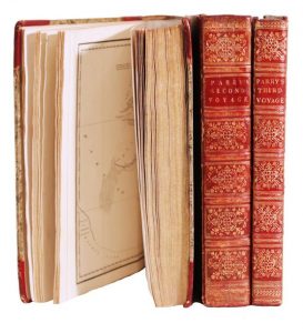 Journal of the Voyage for the Discovery of a North-West Passage from the Atlantic to the Pacific, performed in the years 1819-20, in His Majesty’s Ships Hecla and Griper. With an Appendix, containing the Scientific and other Observations. – Journal of a Second Voyage... performed in the years 1821-22-23. – Journal of a Third Voyage... performed in the years 1824-25. Londres, John Murray, 1821-1826. 3 volumes in-4, demi-maroquin rouge à long grain avec coins, roulette dorée, dos richement orné, tranches lisses (Reliure anglaise de l’époque). Éditions originales des trois voyages polaires de Parry.