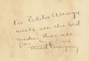 France sous le titre “Pour qui sonne le glas”, véritable ode au peuple espagnol. Exemplaire de premier tirage, avec le “A” en bas du copyright, comprenant un ENVOI AUTOGRAPHE DE L’AUTEUR adressé à l’une de ses amies : For ? ? with all the best wishes there are from er friend Ernest Hemingway Exemplaire enrichi de deux coupures de journaux consacrées à l’auteur, l’une étant collée sur le premier contre plat. Cartonnage usé, charnières intérieures faibles et fendues. Déchirure à la charnière du premier plat. Manque la jaquette.