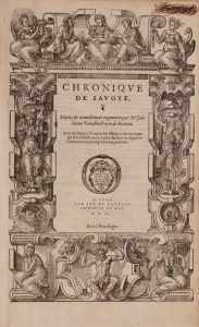 Chronique de Savoye. Lyon, Jean de Tournes, 1560 [ou 1561]. In-folio, veau fauve, double encadrement de triples filets à froid avec fleurons d’angles dorés, fer doré au centre, dos orné de petits fleurons dorés, pièce de titre postérieure, tranches dorées (Reliure de l’époque). Seconde édition considérablement augmentée.