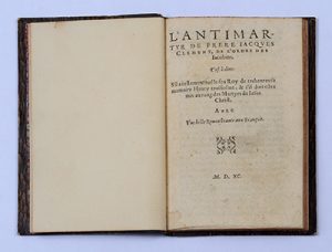 En 1590, Étienne Pasquier est réfugié à Tours, nouvelle capitale royale contre Paris tenue alors par la Ligue, et publie L'Antimartyr de Frere Jacques Clément, de l'ordre des Jacobins... Cette plaquette constitue une réponse à une apologie du régicide de Henri III, Le Martyr de Frère Jacques Clément de l'ordre de Sainct Dominique (1589).