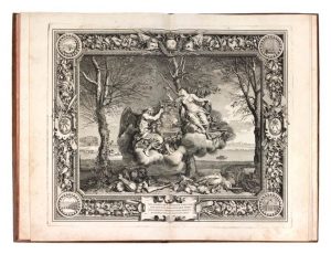 Devises pour tapisseries du Roy, où sont representez les quatre elemens, et les quatre saisons de l'année, peintes en mignature par J. Bailly [...] et gravées par S. Le Clerc. Paris, C. Blageart, 1668. 2 parties en un volume in-folio, basane marbrée, triple filet doré, dos orné, tranches rouges (Reliure du XIXe siècle). Premier tirage rarissime de cette magnifique publication de la collection d'estampes du Cabinet du Roi. Brunet ne la cite qu'à la date de 1670.
