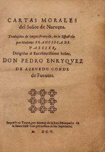 Cartas morales, traduçidas de lengua Françesa, en la Española por Madama Francisca de Passier. Thonon, Marc de La Rue, 1605. Petit in-4, vélin souple (Reliure de l'époque). Rarissime impression de Thonon-les-Bains.